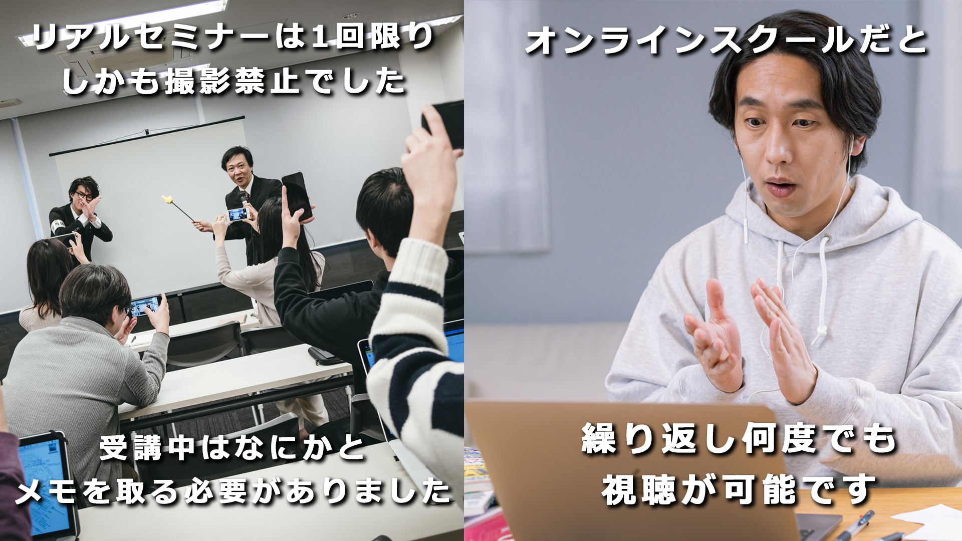 しかもリアルセミナーと違い、繰り返し何度でも視聴する事が可能で、アナタの好きな時間に好きな場所で、誰にも知られることなくこっそり学ぶ事が出来ます。